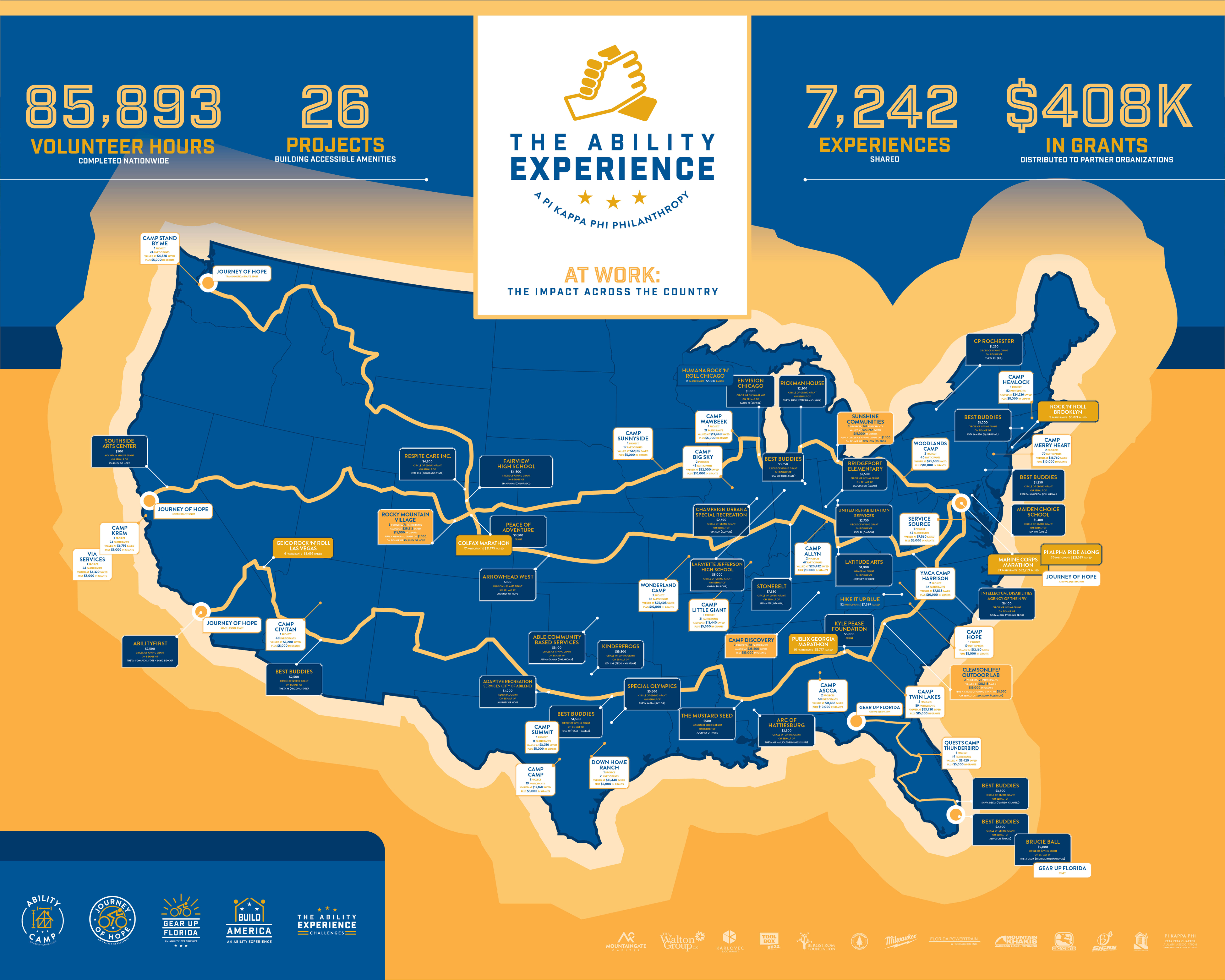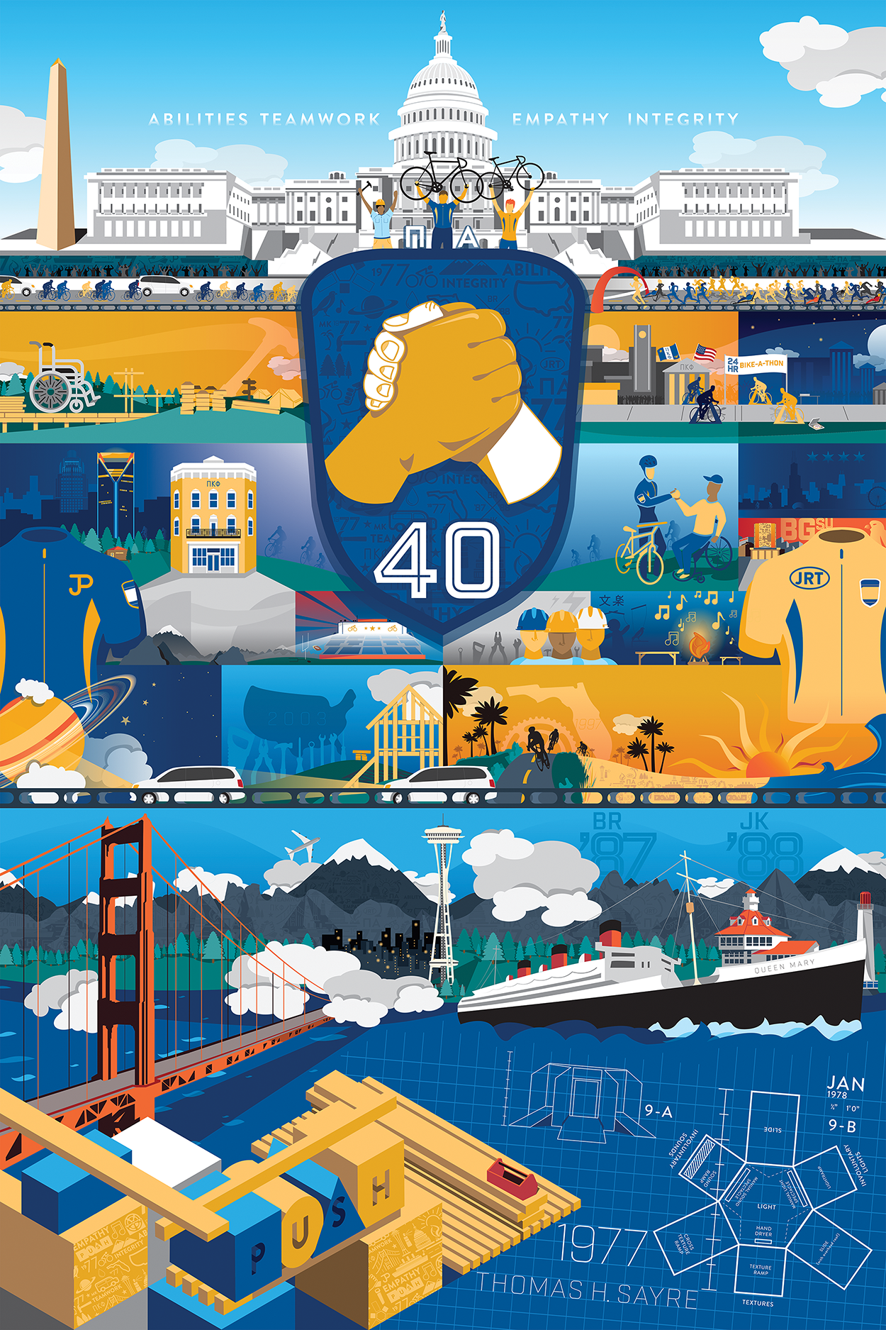 As a special tribute to the 40th anniversary of The Ability Experience, an iconography system was created to represent various aspects of the organization. The illustrated print shows the origins of the philanthropy and tells the story of multiple volunteer projects from across the country. Also using the iconography, the cycling kits are used by nearly 100 student cyclists as they rode from the West Coast to Washington D.C.