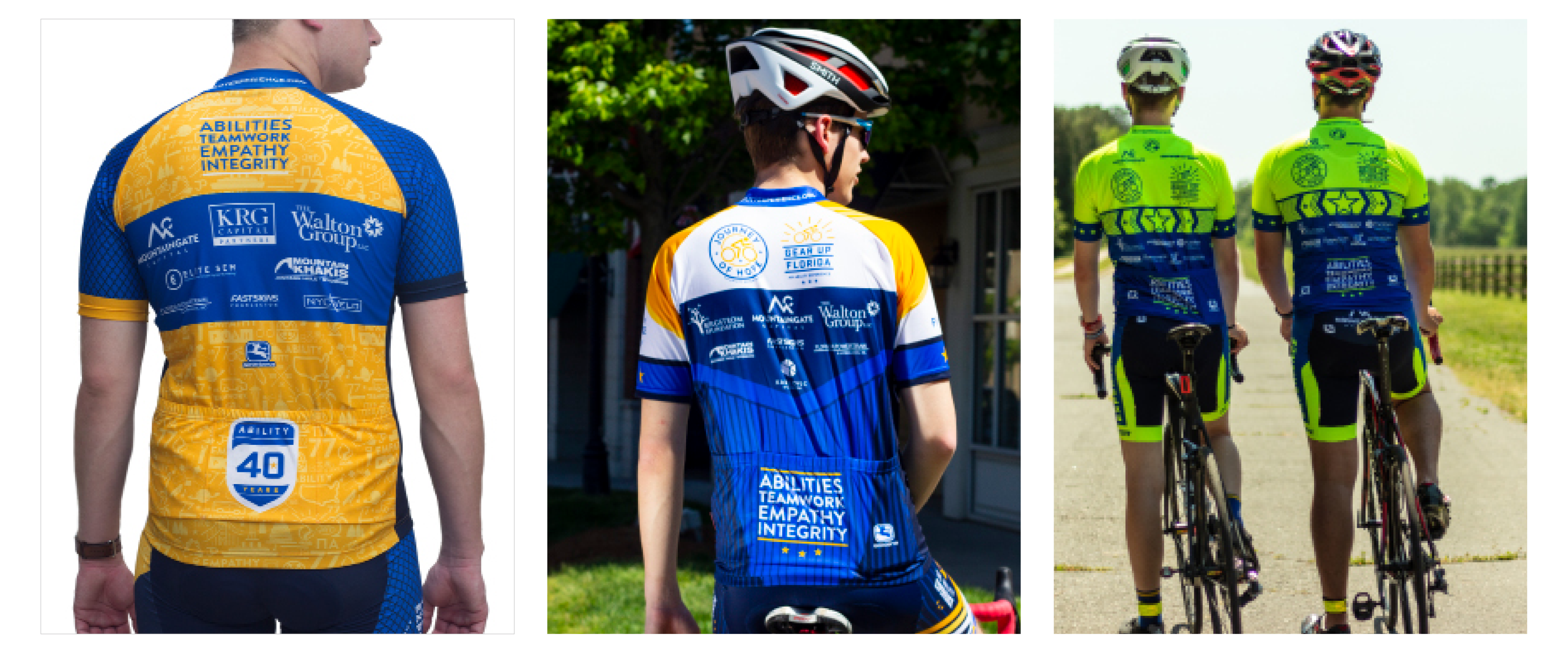 For each new year of team summer events, The Ability Experience designs a cycling kit that sets a branding standard for the summer of team events. Incorporating safety feature standards, these cycling kits are used during The Ability Experience summer team events Gear Up Florida and the Journey of Hope.
