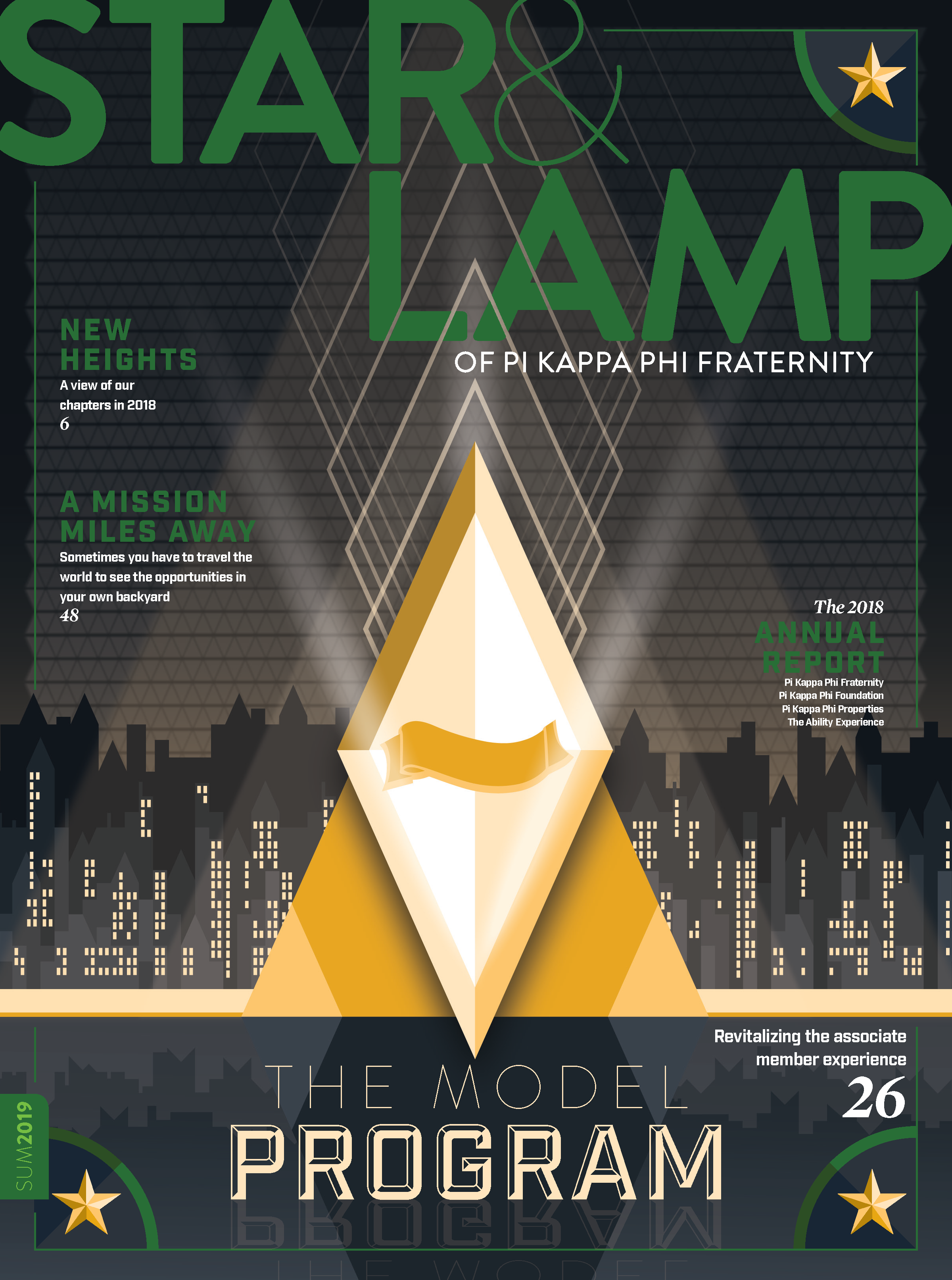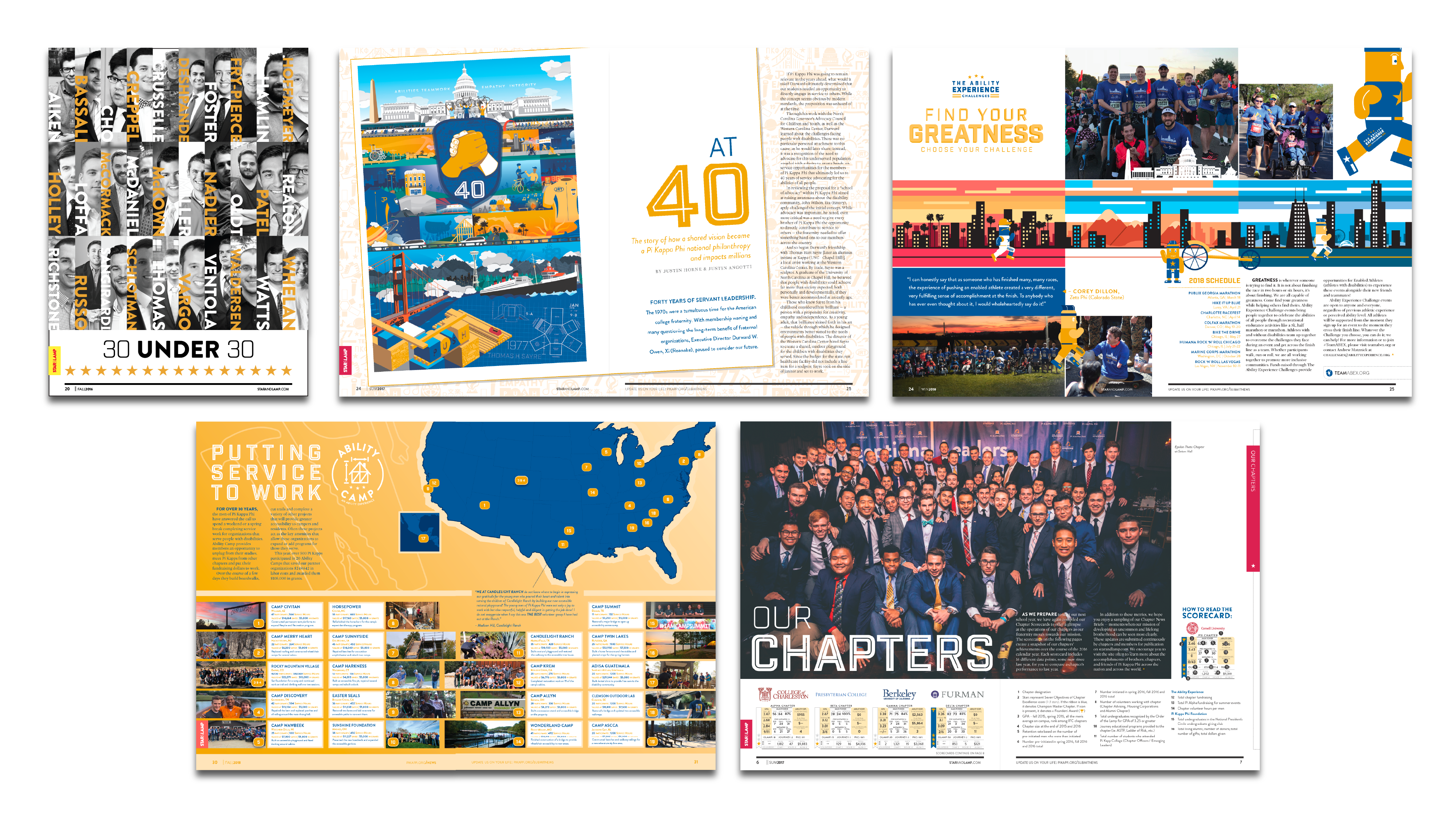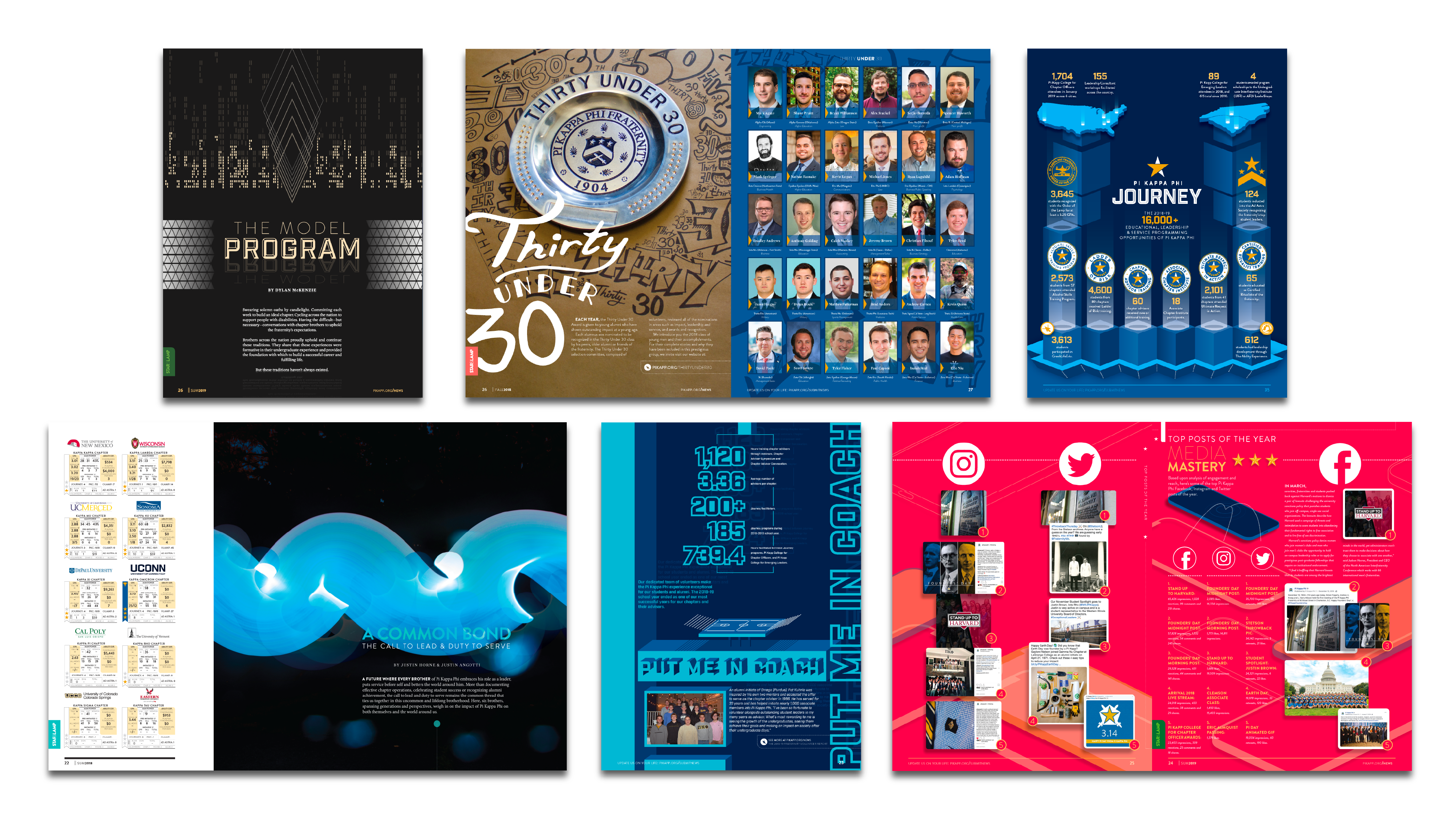 First published in the fall of 1909, the Star & Lamp is the magazine of Pi Kappa Phi Fraternity and is produced in-house. As the official publication of the organization, the Star & Lamp serves as a forum of communication to educate, inspire, and move to action members on fraternity, Greek, and men’s issues. From primary designer to the creative director (while still designing), this magazine evolved from a rinse-and-repeat brochure to an industry, award-winning publication.